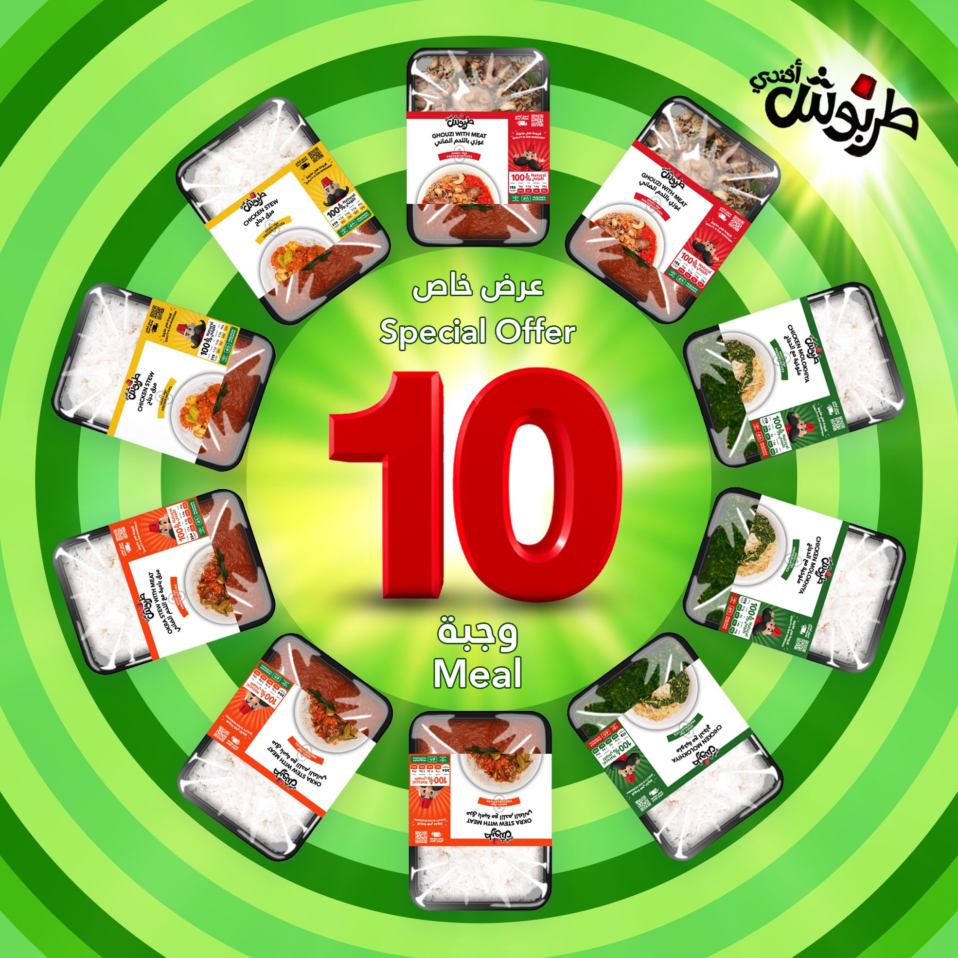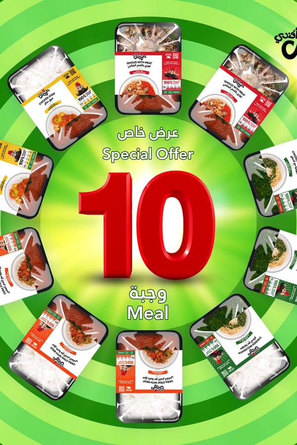 2 meals of lamb ghozi - 3 meals of okra soup with meat - 3 meals of molokhia with chicken - 2 meals of chicken soup
