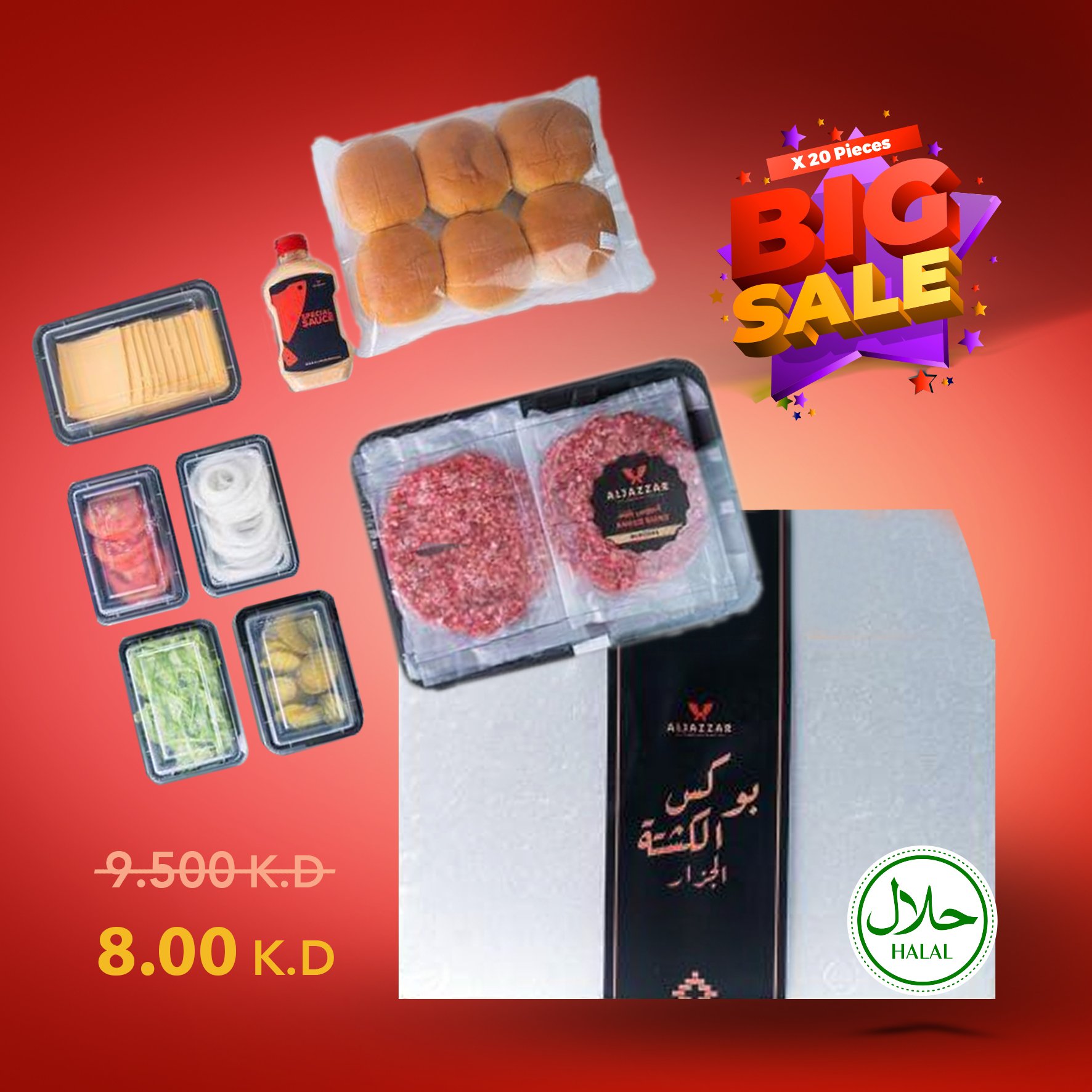 6 Angus Burgers, 6 Potato Buns, 6 Cheese, Tomato, Lettuce, Onion, Pickles, Butcher's Special Sauce
