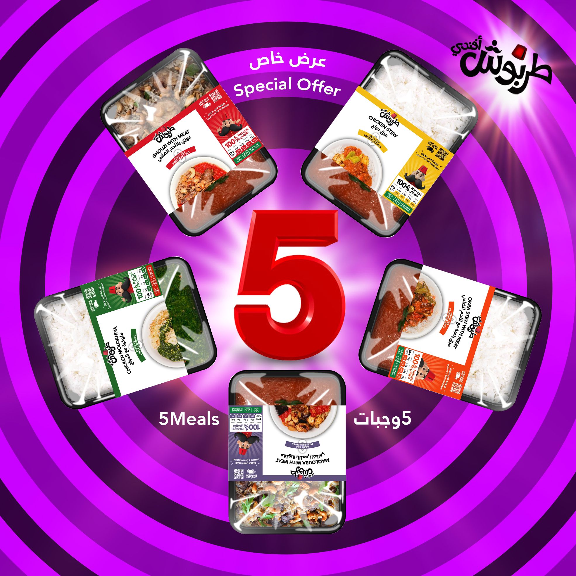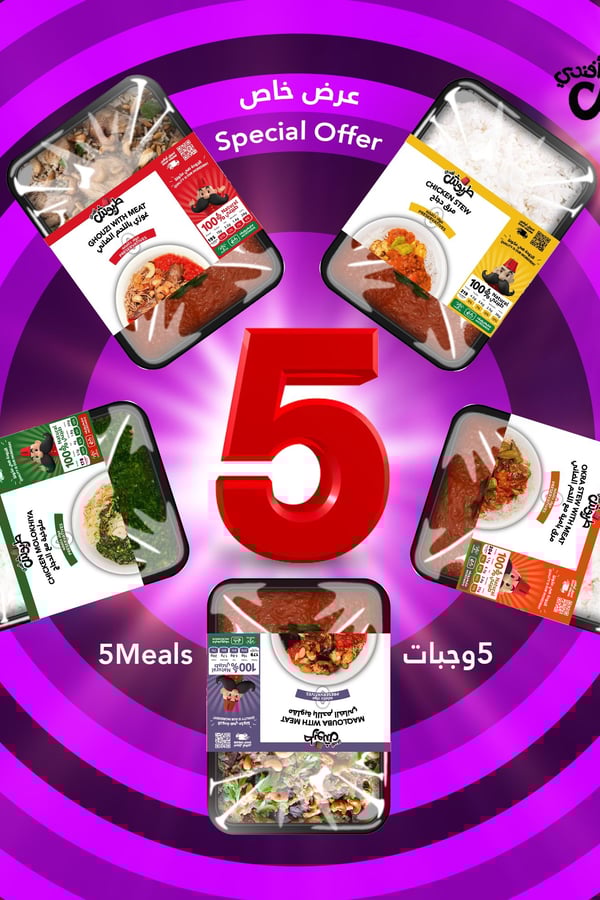 1 meal of lamb ghozi - 1 meal of okra soup with meat - 1 meal of lamb upside down - 1 meal of molokhia with chicken - 1 meal of chicken soup